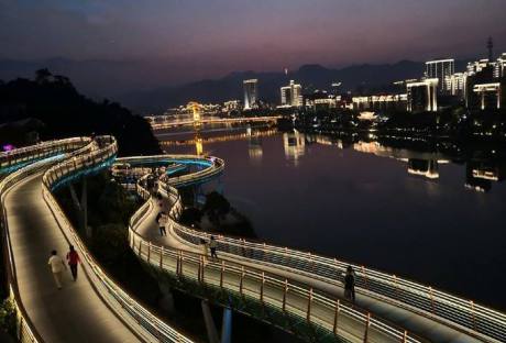 【大洲古渡-夜游沙溪】,位于风景秀丽的淘金山景区脚下大洲村虬江河段。大洲古渡至将军渡的航程约10公里,往返约1.5小时,在船上可以尽情欣赏一河两岸美景。特别设置“七峰叠翠”“将军渡”两个渡口,栈道、花海的美景都收入眼底。夜幕降临,华灯初上,流光溢彩的长桥宛若一条金色巨龙游走于沙县这座小城。