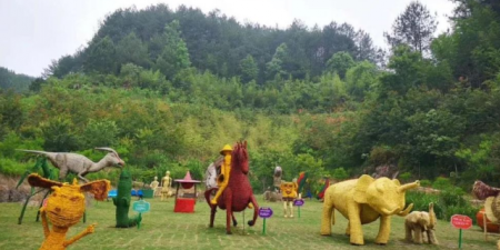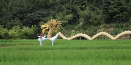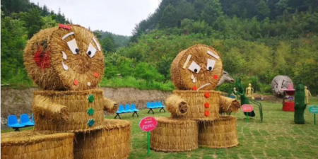 150余座稻草作品,散落分布在整个山谷内。稻草作品均取材于去年本地水稻收割后的稻草,老化的稻草作品将秸秆还田来年作肥料,再用新收割的稻草重新编织。其中最具代表性的创大世界基尼斯记录的中国最大的草编作品——中国龙。总长度150.57米;最大高度6.55米;龙头、龙身由1500多公斤稻草秸秆编织;作品由15人团队耗时3个月完成。草编凤——中国凤,高 5.88 米,长 33 米。除了这些外还有十二生肖等可爱动物主题作品、当地文化主题作品等。