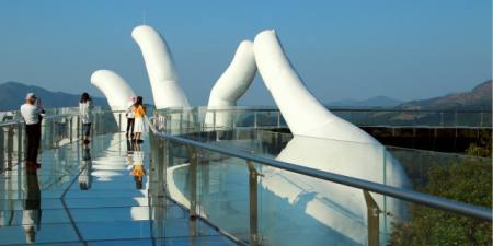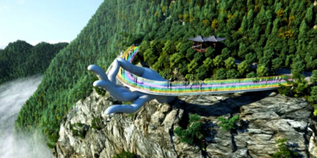 走在古溪星河景区的山谷腹地,向仙亭山方向远远望去,连云叠嶂的山峰中,一只秀窄修长却又丰润白暂的巨手举着一条白色的“丝带”从半空中伸出,仿若是一位仙人要送给凡界一份礼物,十分魔幻。这就是古溪星河即将重磅推出悬空彩虹仙手桥(以下简称“仙手桥”)。